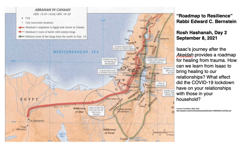 There are tragic consequences to the Akeidah. More than a paradigm of faith, the Akeidah is the ultimate recipe for how to traumatize a family. Within this complex story, though, or at least in its aftermath, we find a layer of hope and redemption. Who is the hero of the redemption of this family? Without a doubt, it is Isaac. This may come as a surprise. Because of his submission on the altar in apparent silence, we tend to regard Isaac as passive. A fresh reading of the text yields a new perspective of Isaac. The secret to understanding Isaac’s greatness lies in the map on your handout.