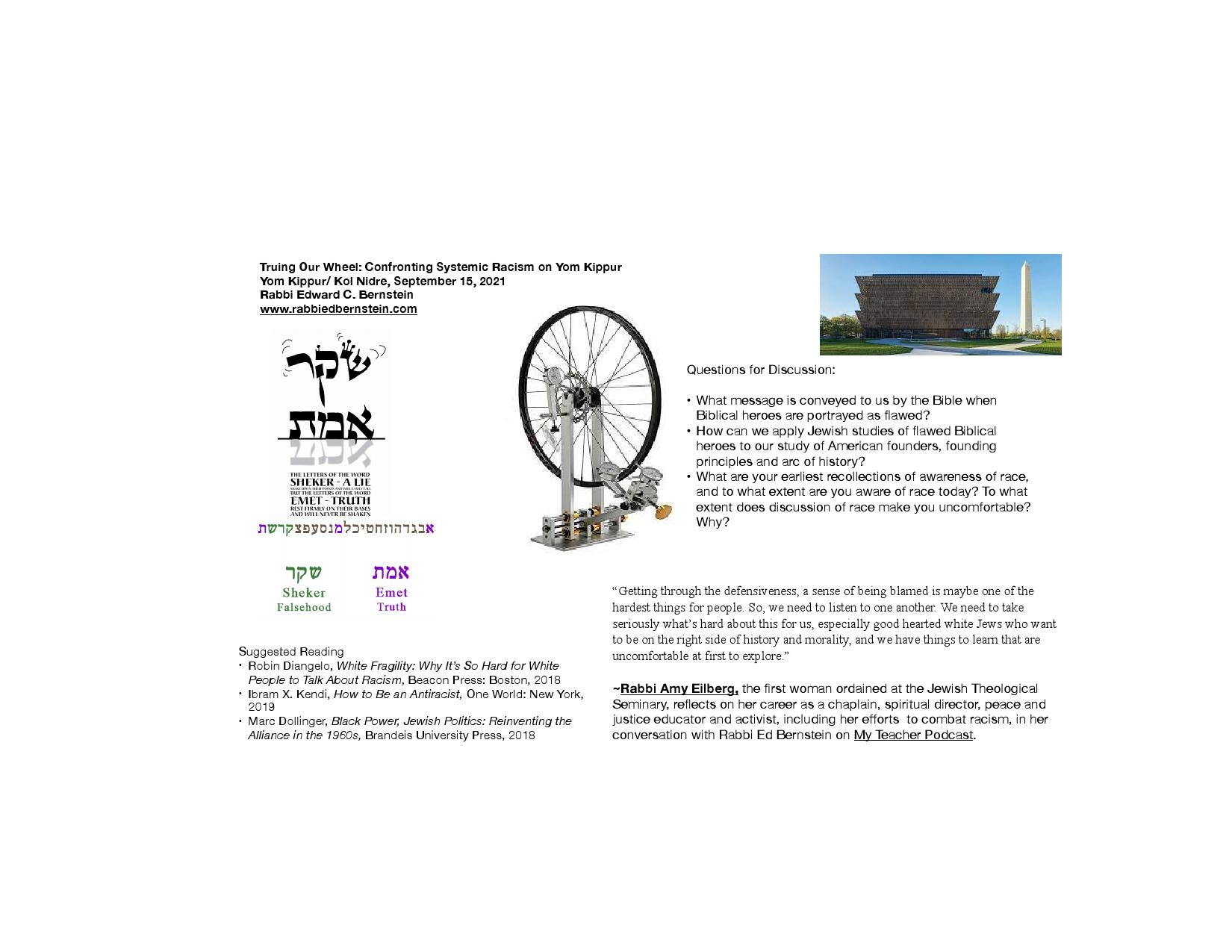 When we say “Al Chet,” we are “truing our wheel” as a community. To do so individually is too hard, so we come together and support one another in the process. By doing this work in our broader American Jewish community, we can help “true the wheel” of our nation, in order for our democracy to reach its fullest potential. Reckoning with historic racial inequality does not make us weaker as a nation. It makes us stronger. When we fail to see the truth and look the other way, we live a life of sheker, a lie.