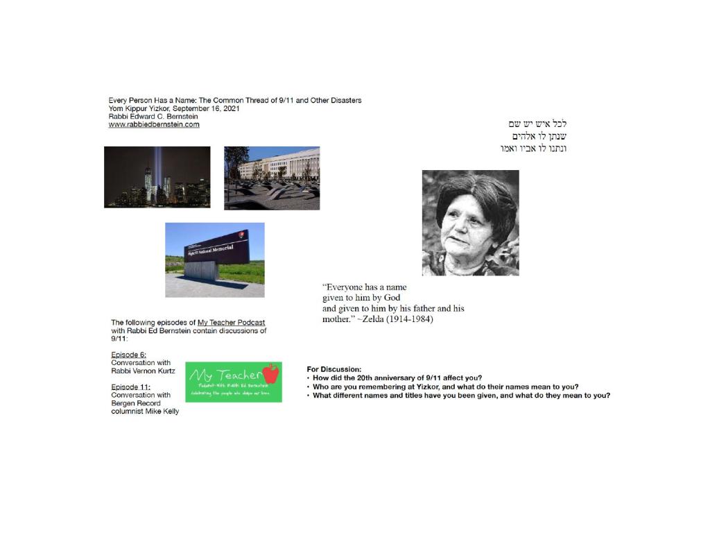 As we remember our loved ones during yizkor, we remember their names, and their names were windows into their souls. Everyone we remember was an entire universe. We think about special times that they spent with us and important lessons that we learned from them. Yom Kippur gives us space to mourn our departed. In doing so, this is a time to hold our living dear ones a little closer. To tell them words that matter and to strengthen our bonds one relationship at a time. L’kol ish yesh shem. Everyone has a name. Let us honor all of our departed, including those martyred on 9/11, and strive to bring love and healing into our world. May the memories of our departed be for a blessing.